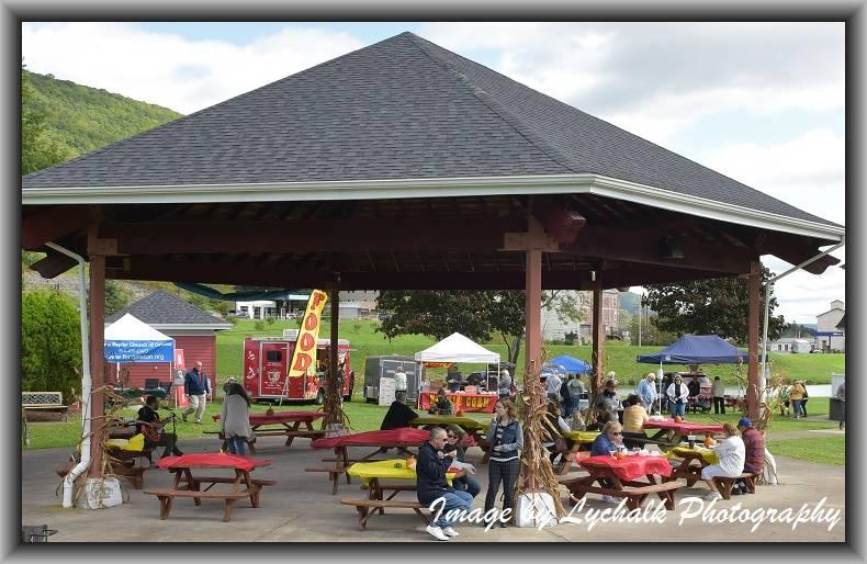 Festival visitors enjoy the pavilion in the park - a great place to rest and enjoy all the great food